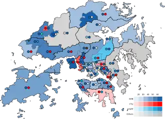 The pro-Beijing camp was able to take back control of several councils, including Kowloon City, Kwun Tong, Wan Chai and North District.[8] The number of the members in some councils also reduced significantly, Wong Tai Sin to just two members, Central and Western District to three members, and Southern District to four, which paralysed some of the functions of these councils.[9] Nevertheless, Chief Executive Carrie Lam in July 2021 announced that no by-elections would be held during her tenure.[10]