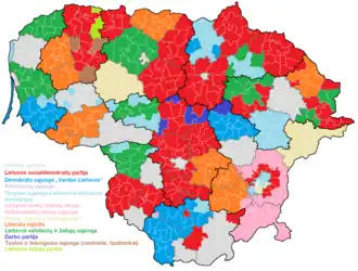 | Social Democratic Party of Lithuania | 204,029 | 18.13 | 358 | 197,796 | 17.28 | 10 | 88,835 | 13.81 | 7 | 17 | |