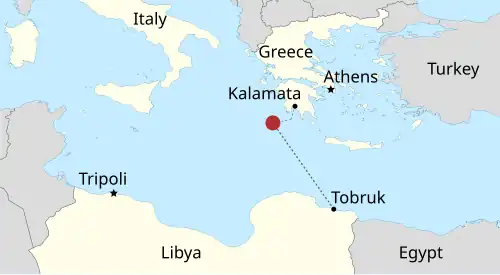 | Location | 80 km (45 nmi) off the coast of Pylos, Greece |