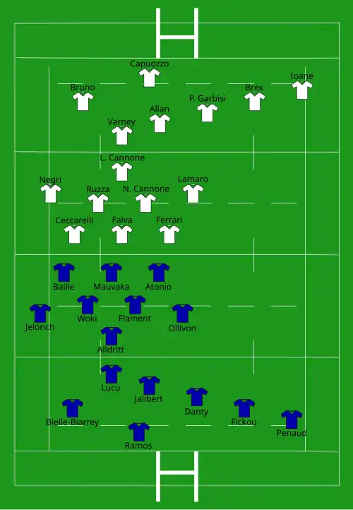 | Try: Penaud (2) 2' c, 38' c Bielle-Biarrey 13' c Ramos 22' c Jalibert 47' c Mauvaka 54' c Moefana (2) 64' c, 76' m Con: Ramos (6/6) 4', 14', 23', 39', 48', 55' Jaminet (1/2) 65' Pen: Ramos (1/2) 7' Jaminet (1/1) 80+1' | Report | Try: Zuliani 71' c Con: Allan (1/1) 72' |