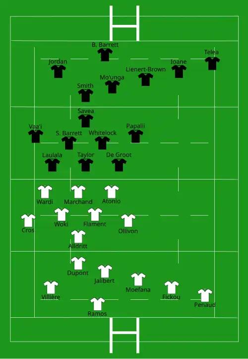 | Try: Penaud 55' c Jaminet 78' m Con: Ramos (1/1) 57' Pen: Ramos (5/7) 5', 20', 29', 65', 74' | Report | Try: Tele'a (2) 2' m, 43' m Pen: Mo'unga (1/1) 25' |