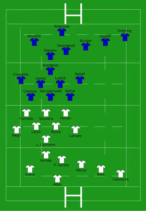 | Try: L. Cannone 11' c P. Garbisi 15' c Lamb 46' c Capuozzo 55' c Faiva 74' c Zuliani 78' c Odogwu 80+3' c Con: Allan (7/7) 12', 16', 48', 57', 75', 79', 80+4' Pen: Allan (1/1) 8' | Report | Try: Mouton 21' m Pen: Swanepoel (1/2) 4' |
