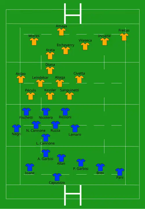 | Try: Pani 7' c Lamaro 46' c Ioane 52' c L. Cannone 56' c Brex 61' c Con: Allan (5/5) 8', 47', 53', 57', 62' Pen: P. Garbisi (1/1) 70' | Report | Try: Penalty try 27' Freitas 37' c Con: Etcheverry (1/1) 38' Drop: Etcheverry (1/1) 42' |