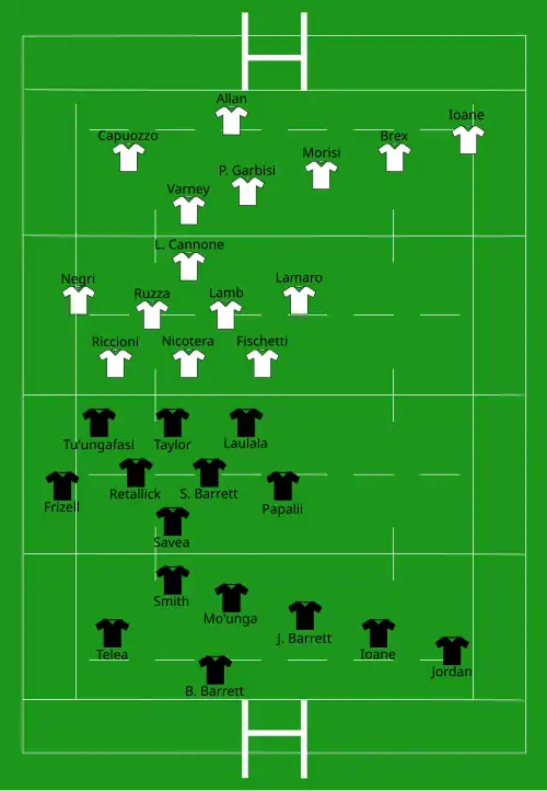 | Try: Jordan (2) 7' c, 70' c Smith (3) 17' c, 27' c, 34' c Tele'a 19' c Savea (2) 22' c, 40+5' c Retallick 50' c Papalii 55' c Coles (2) 61' m, 73' c McKenzie 67' c Lienert-Brown 76' c Con: Mo'unga (9/10) 8', 18', 20, 23', 28', 35', 40+6', 51', 57' McKenzie (4/4) 69', 71', 74', 77' | Report | Try: Capuozzo 48' c Ioane 80+1' c Con: Allan (1/1) 49' P. Garbisi (1/1) 80+3' Pen: Allan (1/1) 10' |