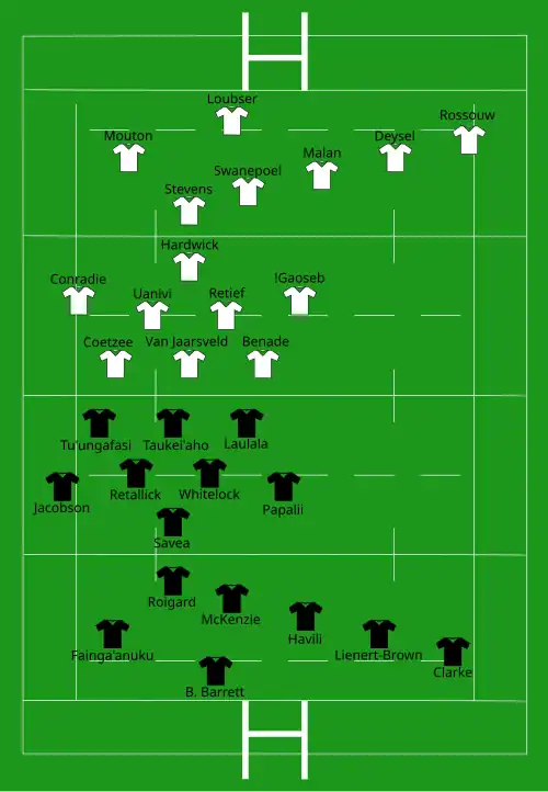| Try: Roigard (2) 2' c, 7' m McKenzie (2) 20' c, 39' c Fainga'anuku 25' m Lienert-Brown 35' c De Groot 49' m Papalii 55' c Havili 58' c Clarke 67' c Ioane 77' c Con: McKenzie (8/11) 3', 20', 36', 40', 55', 59', 68', 78' | Report | Pen: Swanepoel (1/1) 11' |