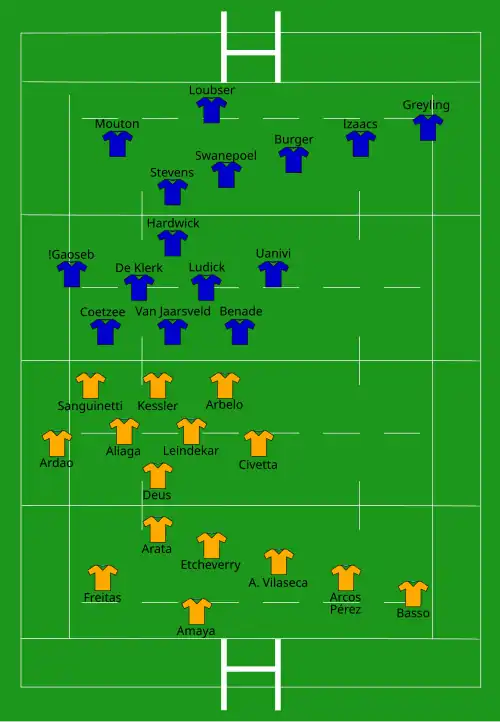 | Try: Amaya (2) 19' m, 49' c Kessler 28' c Arata 54' c Basso 66' c Con: Etcheverry (3/4) 29', 51', 55' Berchesi (1/1) 67' Pen: Berchesi (1/1) 74' | Report | Try: Mouton 1' c Greyling 11' c Con: Swanepoel (2/2) 2', 12' Pen: Swanepoel (4/4) 25', 35', 43', 69' |