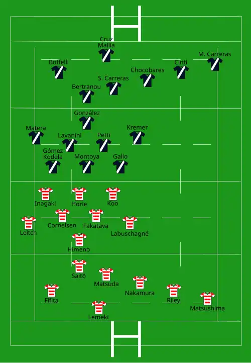 | Try: Fakatava 16' c Saitō 38' c Naikabula 65' c Con: Matsuda (3/3) 17', 39', 67' Pen: Matsuda (1/1) 52' Drop: Lemeki (1/1) 56' | Report | Try: Chocobares 2' c M. Carreras (3) 28' m, 46' c, 68' c Boffelli 58' c Con: Boffelli (3/4) 2', 47', 60' Sánchez (1/1) 70' Pen: Boffelli (1/2) 35' Sánchez (1/1) 75' |