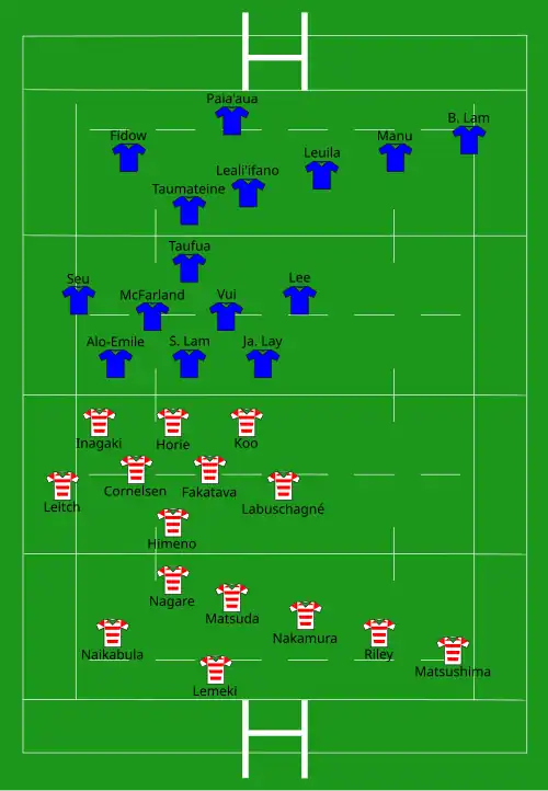 | Try: Labuschagné 13' c Leitch 32' c Himeno 48' m Con: Matsuda (2/3) 15', 33' Pen: Matsuda (3/3) 28', 56', 75' | Report | Try: S. Lam 38' m Paia'aua 65' c Leali'ifano 78' c Con: Leali'ifano (2/3) 66', 79' Pen: Leuila (1/2) 25' |