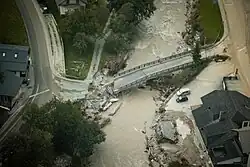 In Tolmin, Cerkno and Idrija, waterways flooded several houses. Residential and other buildings were also flooded in the municipalities of Vodice and Škofja Loka. Moste and Rečica ob Savinji were completely flooded. Luče, Mežica, Dravograd, Laško, Mozirje, Nazarje, Gornji Grad, Škofja Loka, Šoštanj, Florjan, Topolšica, Celje, Begunje na Gorenjskem and Poljče were also flooded. The worst flooding was in the Poljanska and Selška valleys. According to Klemno Šmid, the commander of the Gorenjska civil defense, "Gorenjska is completely under water".[10] In Ljubljana, the Sava and Gradaščica rivers flooded in its upper reaches. In the Polhov Gradec Hills, settlements were mainly threatened by landslides.[14] In Ljubno ob Savinji, the rising river washed away three houses, people were evacuated to the local elementary school. An evacuation was ordered in the center of Celje.[15]