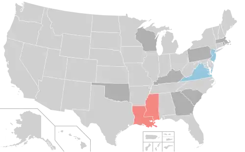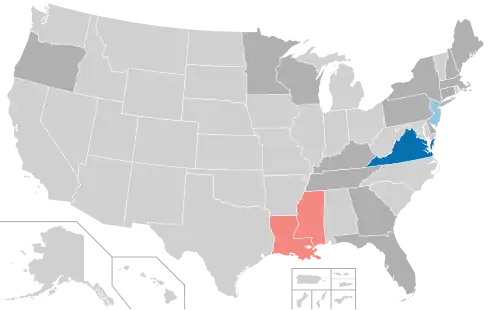 The Democratic Party flipped control of Virginia's lower house, the House of Delegates, which it had lost two years earlier, and retained its majority in Virginia's upper house, the Senate. Democrats also expanded their majority in the New Jersey Legislature. The Republican Party strengthened its majorities in the Mississippi and Louisiana legislatures.