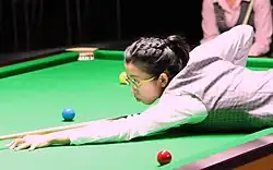 The first qualifying round featured players ranked 81 to 112 against players seeded 113 to 144, including selected amateurs.[17][29][15] The tournament featured five female players, the most in 31 years,[30] although all five lost in the first qualifying round. Mink Nutcharut lost 7–10 to Dechawat Poomjaeng, but made her first century break in professional competition, becoming the first woman since Kelly Fisher in 2002 to make a century in a World Championship match.[31] The following day, Ng On-yee made a 115 break, the highest by a woman in the event's history.[32] However, Ng lost 8–10 to Michael Holt,[33] while Reanne Evans lost 5–10 to Ken Doherty.[34] The reigning women's world champion Baipat Siripaporn lost 3–10 to Aaron Hill, and Rebecca Kenna lost by the same score to Alfie Burden.[31]