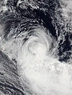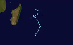 On 8 February, MFR's tropical weather discussions began to highlight the possibility of a storm gradually developing in the northeast of the Mascarene Islands.[87] It gradually organized over favorable environmental conditions with very warm sea surface temperatures and low wind shear.[88] At 00:00 UTC on 15 February, the system was classified as a tropical disturbance.[89] A day later, the system was upgraded to a tropical depression following a significant increase in curved banding.[90] Later that day, the JTWC issued a TCFA, noting a deep convection persisting around the center of circulation.[91] The JTWC upgraded the system to Tropical Cyclone 13S,[92] with the MMS naming it Djoungou a few hours later as it rapidly organized with deep flaring convection around the system's LLLC.[93][94] However, multispectral satellite imagery indicated that the cyclone had developed a banding eye feature.[95] As the eye emerged on visible satellite imagery early on 16 February, and at 18:00 UTC that day, the MFR classified Djoungou as a severe tropical storm.[96] However, a small central dense overcast (CDO) developed over Djoungou; it rapidly developed, becoming a Category 1 equivalent cyclone.[97] Soon afterward, the storm structure evolved the eye pattern and was surrounded by intense convective bursts, becoming a tropical cyclone.[98] Later, Djoungou was upgraded to a Category 4 equivalent major cyclone, with one-minute sustained winds estimated at 230 km/h (145 mph).[99] MFR immediately classified Djoungou as an intense tropical cyclone after the eye gradually improved its convective pattern.[100] However, due to wind shear, the cyclone's increasingly asymmetrical eye disappeared from satellite imagery.[101] Djoungou soon entered into an environment of increasing wind shear, causing its structure to rapidly deteriorate.[102] MFR issued its last advisory on Djoungou as it weakened into a post-tropical depression.[103] On 19 February, Djoungou crossed into the Australian basin to the west-southwest of Learmonth, Western Australia.[10]