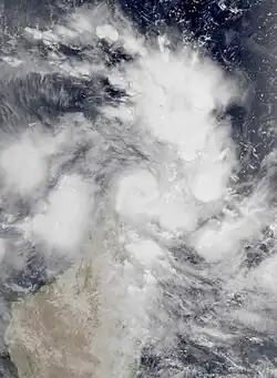 On 25 January, the MFR began highlighting the potential for tropical cyclone development in their daily bulletins, noting an increase in shower activity northeast of St. Brandon.[75] The monsoon trough began to produce persistent convection over the southwestern Indian Ocean.[76] The disturbance continued organizing, and at 00:00 UTC on 30 January, MFR upgraded the system to a tropical disturbance.[77] The same day, the JTWC issued a TCFA for the system as its circulation consolidated,[78] and the next day, it recognised the system as Tropical Cyclone 09S.[79] Convective activity within the disturbance become better organized, resulting in it strengthening to a tropical depression.[80] However, deep convection eventually dissipated,[81] and the system degenerated into a remnant low at 06:00 UTC on 1 February;[82] however, it resumed an increase in convective activity and organization, prompting the MFR to classify the storm as a tropical depression again by the next day.[83] Six hours later, they released their final advisory due to the system being affected by low to moderate wind shear, with its deep convection displaced from the eastern semicircle.[84][85] The JTWC subsequently issued their final advisory on the system, as its circulation became fully exposed.[86]