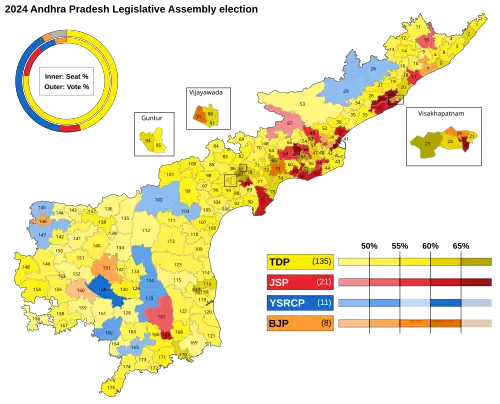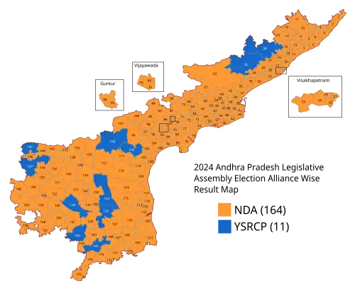 The results of the election were announced on 4 June 2024. The Kutami achieved a sweeping victory securing a total of 164 seats. The TDP won 135 out of the 144 seats it contested, JSP secured all 21 seats it contested and the BJP won 8 out of its 10 contested seats.[132][133] The incumbent YSRCP faced severe anti-incumbency and managed to win only 11 out of the 175 seats it contested.[134][135] This result marked the worst defeat in Andhra Pradesh's electoral history, with the YSRCP unable to even secure the position of the opposition in the state.[136][137] The Kutami swept all districts except for the Alluri Sitharama Raju, causing the YSRCP to lose many of its previously considered strongholds.[138][139][140][141] The INDIA alliance failed to win any seats in this election.