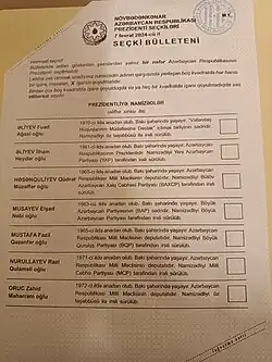 - ^ "Çap olunacaq seçki bülletenlərinin sayı açıqlandı". modern.az (in Azerbaijani). 30 December 2023. Archived from the original on 30 December 2023. Retrieved 6 February 2024.