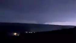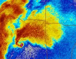 The nearby Gan's Mall had its newly installed roof thrown across the road, which ended up trapping several people inside the Hampton Inn.[21] The tornado then exited the town as the parent supercell became absorbed into the trailing squall line, which caused the tornado to dissipate northeast of the town near Dewey at 10:07 pm. CDT (03:07 UTC). The tornado was on the ground for approximately 55 minutes, traveling a total length of 40.81 miles (65.68 km), reaching a peak width of 1,700 yards (1,600 m) at times. Along with the two fatalities, 33 other people were injured and the tornado caused $25 million in damage.[9][10][22]