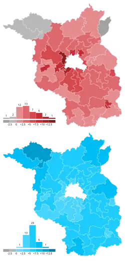 The AfD won the most constituencies (Direktmandat). This was the worst result for CDU in any state election in the east. Lead candidate Jan Redmann was critical of what he called Woidke's "AfD or me" campaign tactics, arguing that it only served to depress the vote share of the other mainstream parties and did not dissuade anyone from voting for AfD.[14][15] As well, state party leaders criticized CDU Minister-President Michael Kretschmer of Saxony's endorsement of Woidke in the run-up to the election; general secretary Gordon Hoffmann called the endorsement "uncooperative" while Redmann stated it was "completely unhelpful" and disappointed CDU campaigners.[16] The CDU campaign was also damaged by Redmann's arrest for drunk driving in Potsdam in mid-July. He was stopped driving an electric scooter with a blood alcohol content of 1.28 per mille (0.128%), well above the 0.5 legal limit and also past the limit of 1.1 where the offense becomes a crime with a potential prison sentence instead of only a fine. Despite questions about his fitness for office, he remained their lead candidate.[17][18]