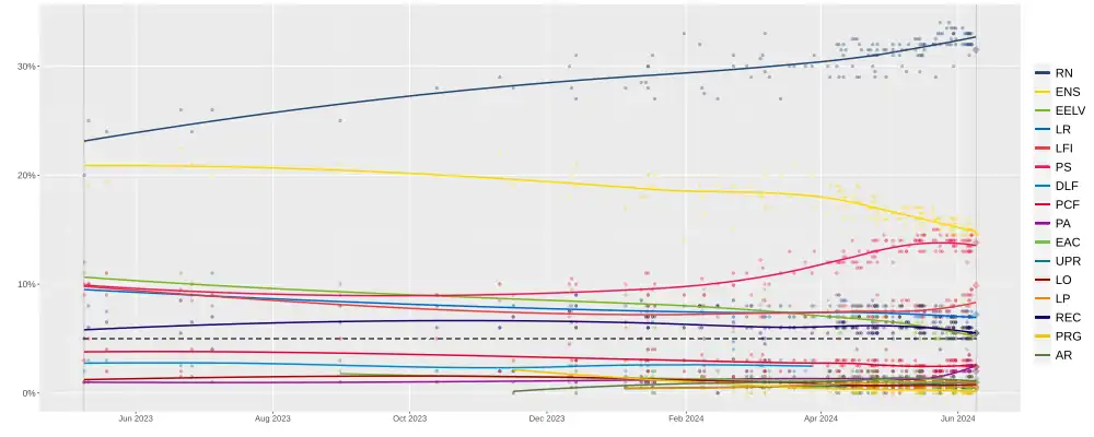 About one hour after results for the European Parliament election showed that his Renaissance party would place a distant second to National Rally, Emmanuel Macron called for the dissolution of parliament and snap legislative elections occurring in two rounds on 30 June and 7 July. He decried the results of the election as indicating the rise of nationalists and far-right political firebrands that would threaten France and Europe, who represented the "impoverishment of the French people and the downfall of our country".[27]