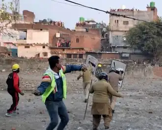 As the police began to clear the illegal encroachment, angry residents descended to the streets to protest the removal of the illegal structures. They began breaking barricades and arguing with police personnel. As the clearing of the structure continued, the mob began pelting stones at the police, leaving over 60 injured, including police personnel. The police used non-lethal force, including tear gas and lathis to clear the crowd; however, tensions escalated, leading to the mob setting fire to several vehicles. Rioting continued until the evening, when the mob also set Banbhoolpura Police Station on fire.[17] The Uttarakhand government on 11 February 2024 demanded four additional companies of Central Armed Police Forces from the Ministry of Home Affairs after it had already sent four of them earlier.[18][19] The police confirmed that the violence was pre-planned, and that the rioters had attacked the police joint anti-encroachment team without any provocation.[20]