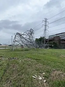 As the derecho moved through the Greater Houston area, it produced wind gusts of up to 100 mph (161 km/h) in Downtown Houston.[2] The derecho was considered the worst damaging wind event to affect Houston in nearly 25 years. The strong winds in Downtown Houston blew out the windows of many high-rise buildings in the area, littering the streets below with broken glass. A brick building occupied by a bar near the intersection of Congress Street and Travis Street suffered the collapse of a wall.[24] The derecho caused extensive damage to transmission lines along with widespread straight-line damage and more than a million customers lost power in the Greater Houston area and nearby counties as a result of the high winds.[25] More than 24 hours later, almost 555,000 customers still remained without power,[26] and by Wednesday of the following week, when repairs were initially expected to be finished, nearly 60,000 homes, businesses, and schools in the worst hit areas of the city were still without power.[27]
