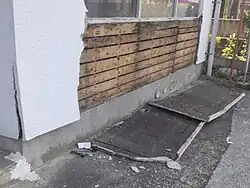 The earthquake injured at least 16 people, three of them in a serious condition, collapsed or severely damaged three houses and damaged 77 others across Kyushu.[23] Ten people were injured in Miyazaki Prefecture.[23] In Nichinan, the Obi Castle Town sustained damage. A section of National Route 220 was closed due to rockfalls. A house partially collapsed in Miyazaki, and ten buildings as well as the Miyazaki Airport received minor damage. Two flights each of All Nippon Airways and Solaseed Air were canceled, and some flights of Japan Airlines from the airport were delayed. Water pipe leaks occurred in Kushima. In Kagoshima Prefecture, four people were injured,[23] several walls and a two-story house collapsed, and roads were raised in Ōsaki. A landslide was reported in Shibushi. Two people were injured in Kumamoto Prefecture.[24][25][26][27]
