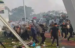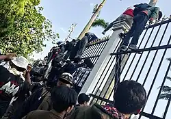 At noon, at 2:20 PM., the crowd tore down the right gate of the House of Representatives,[97] followed by the collapse of the rear gate by another group of protesters on 5:30 PM.[98] One of the members of the House of Representatives, Habiburokhman, was hit by a bottle thrown by the protesters.[99] The protest lasted into the night and police were recorded as beating, using tear gas, and firing water cannons to deal with the crowd. [100][101] Tempo, Narasi, and IDN journalists were mistreated for trying to cover protesters being beaten by the authorities and were asked to delete their video footage.[102][103][104] The director of Lokataru, Delpedro Marhaen, was also mistreated and arrested.[105]