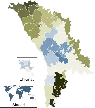 ![]() Results by first-level administrative divisions, sectors of Chișinău and abroad Yes: 50–55% 55–60% 60–65% 65–70% 75–80% No: 50–55% 55–60% 60–65% 65–70% 70–75% 75–80% 90–95% | ||||||||||||||||||||||