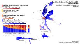 Sherly Tjoanda and Sarbin Sehe won the election with 51%.[23] Her victory was hailed as a historic win as she was the first Chinese Indonesian Protestant woman to be elected governor.[24][25] She along with Hidayat Arsani who won the 2024 Bangka Belitung Islands gubernatorial election, and Ria Norsan who won the 2024 West Kalimantan gubernatorial election, created another historic milestone as the first Chinese Indonesians who were directly elected as Governor after failed attempts to reach this milestone by Basuki Tjahaja Purnama who contested the 2007 Bangka Belitung Islands gubernatorial election and the 2017 Jakarta gubernatorial election.[26]