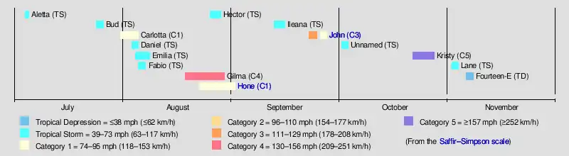 The 2024 Pacific hurricane season was a slightly below-average season that saw 15 tropical cyclones develop overall, of which 13 developed into named storms.[nb 1] Among them, 5 developed into hurricanes, of which 3 intensified into major hurricanes. The season officially began on May 15 in the eastern Pacific basin (east of 140°W) and on June 1 in the central Pacific (between 140°W and the International Date Line); both ended on November 30. These dates, adopted by convention, historically describe the period in each year when most subtropical or tropical cyclogenesis occurs in these regions of the Pacific Ocean.[1] For the third consecutive year, there were no pre-season tropical cyclones in either basin, and the season got off to the slowest start of any Pacific hurricane season on record in the satellite era, [2] with the first eastern Pacific tropical storm, Aletta, not forming until July 4. The first (and only) central Pacific tropical cyclone, Hurricane Hone, formed on August 22, becoming the first named storm to develop in the basin since 2019.[3] The final system of the season, Tropical Depression Fourteen‑E, dissipated on November 7.