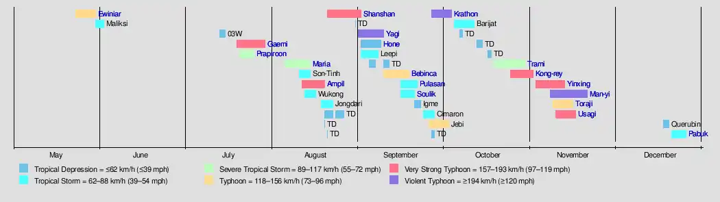 The 2024 Pacific typhoon season was the fifth-latest starting Pacific typhoon season on record. It was average in terms of activity, and ended a four year streak of below average seasons that started in 2020. It was also the deadliest season since 2013, and became the fourth-costliest Pacific typhoon season on record, mostly due to Typhoon Yagi. This season saw an unusually active November, with the month seeing four simultaneously active named storms. The season runs throughout 2024, though most tropical cyclones typically develop between May and November. The season's first named storm, Ewiniar, developed on May 25, and eventually intensified into the first typhoon of the season, while the last named storm, Pabuk, dissipated on December 25. This season was an event in the annual cycle of tropical cyclone formation in the western Pacific Ocean, and it featured the most retired names in a single season—nine.