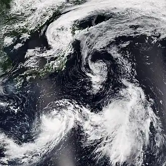 Two days later, on September 24, a tropical depression formed in the Pacific south of Japan. That day, JTWC designated the system as 18W. The following day, the JMA upgraded the depression into a tropical storm, assigning it the name Cimaron. The storm moved southwestwards, maintaining its intensity. As it moved westwards, Cimaron weakened into a tropical depression as an unfavorable environment hindered any intensification. Cimaron later dissipated on September 27. Shortly later the same day, another low-pressure area formed near the Northern Mariana Islands. Despite being in a marginal environment, the disturbance managed to organize and was designated as 19W by the JTWC. On September 27, the JMA upgraded 19W into a tropical storm, naming it Jebi. At first, Jebi struggled to organize due to the presence of moderate low-level wind shear, causing Jebi to weaken into a tropical depression. However, Jebi redeveloped back into a tropical storm after. The storm continued to organize until it further intensified into a Category 1 typhoon by the JTWC, while according to the JMA, it only reached the intensity of a severe tropical storm. Jebi later transitioned to an extratropical cyclone, and both agencies issued their final warning on October 2.