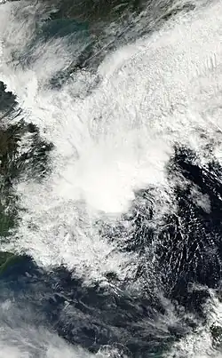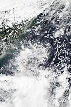 Later that day, both systems intensified into tropical storms and were named Man-yi and Toraji by the JMA. On November 10, Toraji continued to strengthen and was upgraded to a severe tropical storm by the JMA, while the JTWC classified it as a Category 1 typhoon as its outer bands became more organized. The JMA subsequently upgraded Toraji to typhoon status before it made landfall in Dilasag, Aurora. The system then exited into the South China Sea near Magsingal, Ilocos Sur, with satellite imagery showing a compact and tightly wrapped low-level circulation. As Toraji moved northwestward, its low-level circular convection weakened over the center, and the storm was downgraded to a tropical storm on November 11. Satellite imagery later showed a weakening of deep convection at its center, with low-level cloud banding visible around the center and along the southern edge of the circulation. This was attributed to strong southerly vertical wind shear as the system became embedded in the low-level northeasterly flow associated with a cold surge. As a result of convective decapitation that left the low-level circulation fully exposed, the JTWC issued its final advisory on November 14, downgrading the system to a tropical depression. The JMA continued monitoring the system until it was last noted at 06:00 UTC on November 15.