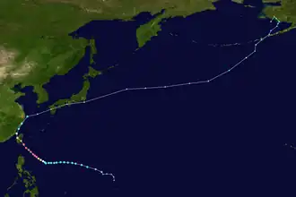 Meanwhile, on November 9, a tropical depression formed near Micronesia. The following day, the JMA began issuing warnings on the system. On November 11, the JTWC upgraded it into a tropical depression, designating it as 27W. By early morning of the next day, 27W intensified into a tropical storm, prompting the JMA to assign the name Usagi. This marks the first time in reliable meteorological records that four active systems were active simultaneously in the basin during November.[9] Around the same time, Usagi entered the PAR, receiving the local name Ofel from PAGASA. The storm continued to intensify and underwent a period of rapid intensification, reaching Category 4-equivalent super typhoon strength on November 14. At 13:30 PHT (05:30 UTC) of the same day, Usagi made landfall over Baggao, Cagayan. After landfall, Usagi began to weaken as its eye became obscured due to interaction with mountainous terrain. After crossing northern Luzon, it emerged into the Babuyan Channel, moving northwestward along the edge of a mid-level subtropical high. The system passed near the Babuyan Islands and northern Cagayan, prompting the JMA to downgrade it to a severe tropical storm. Satellite imagery showed a weakening low-level circulation with convection displaced northeast of a partially exposed center. As Usagi drifted southwest of Taiwan, it continued to weaken due to strong vertical wind shear, leading the JTWC to issue its final warning on November 16. The JMA monitored the system until it dissipated at 12:00 UTC on the same day.
