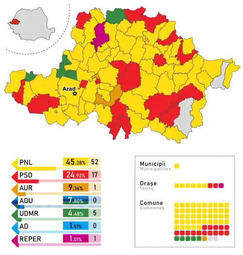 - ^ AUR lost one of its three mayors in June 2022. The respective mayor was from Vrancea County and switched, at that time, to PNL.[11]