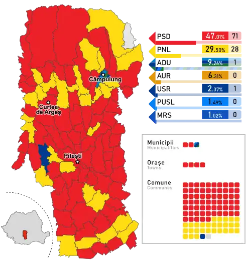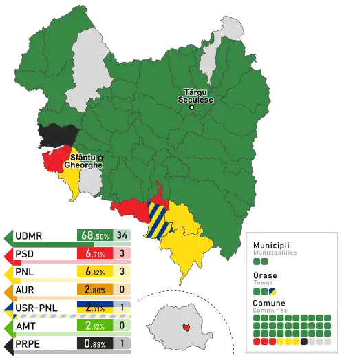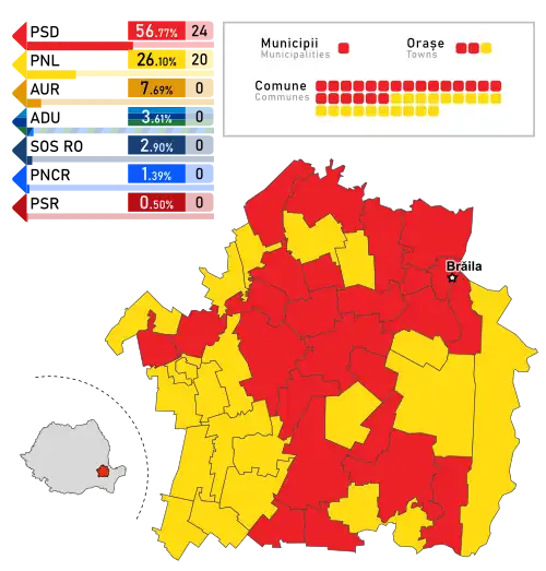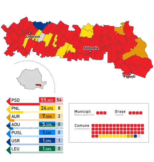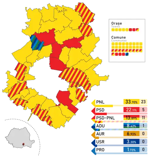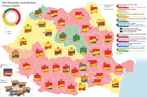 - ^ The total number of County Councilors in the country decreased by 2 since the 2020 election, as Ilfov County gained 2, while Gorj County and Teleorman County lost 2 each