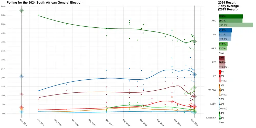 Support for the ruling African National Congress (ANC) significantly declined in this election; the ANC remained the largest party but lost the parliamentary majority that it had held since the inaugural post-apartheid election in 1994. The centrist Democratic Alliance (DA) remained in second place with a slight increase. uMkhonto we Sizwe (MK), a left-wing populist party founded 6 months prior to the election and led by former president Jacob Zuma, came in third place.[3]