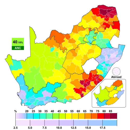 Voter turnout has declined since the end of apartheid, when 86% of eligible voters turned out.[33] For this election, 27 million people were eligible to vote.[34] Fifty-five percent of them were women, while voter registration was highest among those aged between 30 and 39 years old.[35] Only 58% of the country's registered voters voted in the election.