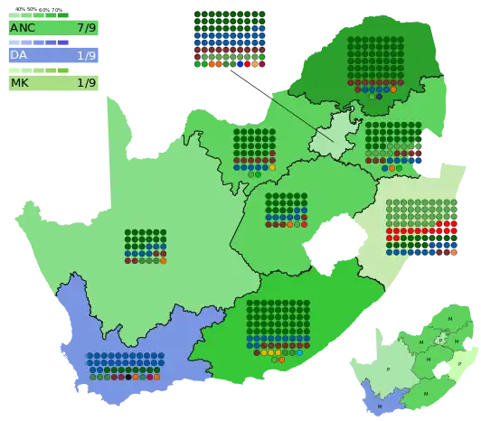 General elections were held in South Africa on 29 May 2024 to elect a new National Assembly as well as the provincial legislature in each of the nine provinces.[1][2] This was the 7th general election held under the conditions of universal adult suffrage since the end of the apartheid era in 1994. The new National Council of Provinces (NCOP) will be elected at the first sitting of each provincial legislature.