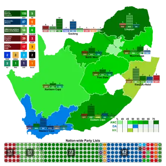 In June 2020, the Constitutional Court ruled in New Nation Movement NPC v President of the Republic of South Africa that the Electoral Act was unconstitutional to the extent that it did not allow independents to contest national and provincial elections.[36] Since the first elections held under universal suffrage, 400 members elected were elected to the National Assembly by a system of proportional representation with a closed list approach. Two hundred members were elected from national party lists, while the other 200 were elected from provincial party lists in each of the nine provinces. The national list seats were awarded by subtracting seats won at the provincial level from each party's national allocation to generate a maximally proportional result. The Droop quota variant of the largest remainder method was used to allocate seats at both the national and provincial levels.[37] Provincial legislatures were also elected by a system of proportional representation with closed party lists.