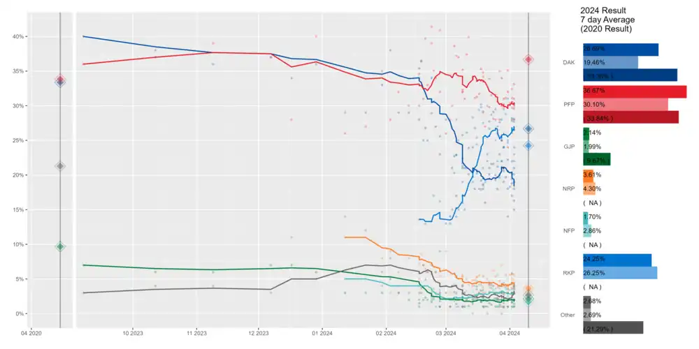 - ^ Including the Basic Income Party in seat totals, which only won seats through the Democratic Alliance proportional list. The Progressive Party won a separate FPTP district, and ran against the DPK in certain provinces.