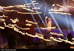 The ceremony concluded with a laser light and fireworks display. Dancers performed on stage, which was flooded with colour in tribute to British artist Sue Austin, who used a wheelchair to paint, while Christine and the Queens sang Patrick Hernandez's "Born to Be Alive".[8]