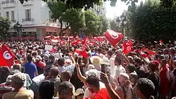 On 25 July 2021, Republic Day, after months of political crisis between President of the Republic, Kais Saied and the Assembly of the Representatives of the People, thousands of protesters demanded the latter's dissolution and a change of regime.[7] The government was criticized for the catastrophic state of the economy and its inaction, which led in particular to the worsening of the health crisis linked to the COVID-19 pandemic.[8] That same evening, invoking Article 80 of the 2014 Constitution, Kais Saied dismissed the Mechichi Cabinet with immediate effect, in particular Hichem Mechichi from his duties as head of government and interim Minister of the Interior, announced the suspension of the assembly (whose members he lifted their immunity), the formation of a new government (which would be accountable to him) and his decision to govern by decree; he also indicated that he would chair the prosecution.[9] Ennahda immediately denounced a "coup d'état".[10] This description of a coup d'état is shared by political analysts and lawyers.[11]