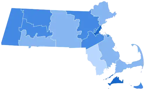 Harris won Massachusetts, including every county in the state, winning it by 25 points. This was an 8-point smaller margin than Biden, following a trend of blue states, such as New York, California and Illinois, shifting significantly red.[2] Massachusetts featured the largest swing right by 8 points statewide without a county being flipped as a result.
