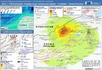 According to the USGS' PAGER service, the earthquake had a maximum Modified Mercalli intensity of IX (Violent), and that 227,000 people were exposed to damaging shaking intensities above VI (Strong).[3] The tremors were felt across Xinjiang, including in Tacheng,[15] Ürümqi, Hotan, Kashgar,[16] Korla and Yining.[17] It was also felt as far away as neighbouring Kazakhstan and Kyrgyzstan, forcing residents of Almaty and Bishkek into the streets,[18] as well as in Uzbekistan and Delhi, India.[19] In Kazakhstan, the MSK-64 intensity was estimated at V in Almaty and II in Shymkent.[20] In Jeti-Ögüz District of Issyk-Kul Region in Kyrgyzstan, the MSK-64 intensity was VI.[21]