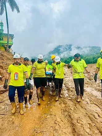 The District Administration were effective in collaborating IAG group under the leadership its Executive Committee. There were several organisation worked under the leadership of IAG( Inter Agency Group) and District Emergency Operation Center (DEOC) become the center point of coordination and allocation of such needs. An effective system were in place to manage the volunteers by the IAG and Numerous volunteers from political parties, charity institutions, religious, social, and cultural organizations registered themselves with the district administration and became involved at the affected sites and relief camps.[116] These included Seva Bharati, White Guard Volunteers, Mata Amritanandamayi Math, Indian Youth Congress, Sunni Students' Federation,Democratic Youth Federation of India, All India Youth Federation,[117][118] People's Foundation and Ideal Relief Wing.[119][120] Volunteers from the Bharat Scouts and Guides, the National Service Scheme (NSS), and the National Cadet Corps (NCC) also assisted.[121] School teachers motivated their students to take part in to the NSS and NCC programmes.[122] Students from various schools in Wayanad also distributed relief materials and food supplies to the landslide survivors, and provided physical assistance and emotional support.[123]