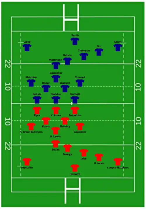 | Try: Muir 8' m Aldcroft 15' c Botterman 24' c Atkin-Davies 40' +2 m Kildunne (2) 43' m, 62' m Dow 46' m Galligan 58' c Con: Aitchison (3/8) 16', 25', 59' | Report | Try: Bevan 54' c Con: George (1/1) 55' Pen: George (1/1) 5' |