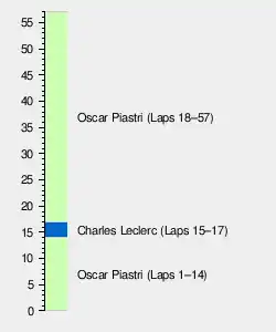 Polesitter Oscar Piastri of McLaren successfully defended his lead into turn 1 after a challenge from George Russell of Mercedes, who gained one position to move into 2nd place. Piastri's teammate Lando Norris took third having started from sixth, before being awarded a penalty for not lining up correctly in his grid spot. Russell's teammate, Kimi Antonelli, initially passed Pierre Gasly of Alpine on the run to turn 1 to hold 5th place, but was then repassed by Gasly at turn 6. This forced Antonelli to run wide, resulting in him losing out to Carlos Sainz. Jr of Williams at the exit of the turn 8 hairpin, and he completed the first lap in 7th. On lap 5, Antonelli repassed Sainz at turn 1, with Max Verstappen of Red Bull following him through at turn 6. On lap 9, Leclerc's teammate Lewis Hamilton attempted to pass Sainz at turn 4, however ran wide exiting the turn; this allowed Sainz to retake the place at turn 6. Hamilton made the move stick at turn 11, with Verstappen's teammate Yuki Tsunoda also getting through at turn 12, dropping Sainz to 9th. [25]