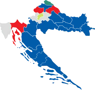 | Split-Dalmatia | HDZ, DP, HSP AS (39.82%) | 42.83% | Blaženko Boban, HDZ (58.97%) | 33.06% | runoff election | ||