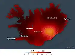 In mid-May, Iceland experienced a record-breaking heatwave, with temperatures reaching at least 20 °C (68 °F) for ten consecutive days between 13 and 22 May. The country's record for the highest May temperature was broken on 15 May at Egilsstaðir Airport, where 26.6 °C (79.9 °F) was recorded; the previous record of 25.6 °C (78.1 °F), recorded in 1992, was surpassed three more times during the heatwave. Furthermore, 94% of the automatic weather stations in the country which have been in operation for at least 20 years broke their records for the maximum May temperature; three staffed stations also broke their records for the maximum May temperature, including Stykkishólmur which has been in operation for 174 years.[50]
