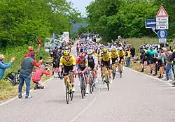 Other riders expected to compete for the podium were Adam Yates (UAE Team Emirates XRG), Ayuso's teammate and potential co-leader who finished third in the 2023 Tour de France.[9] His twin brother Simon Yates (Visma–Lease a Bike), a former Vuelta champion, and Richard Carapaz (EF Education–EasyPost), Giro champion in 2019, were listed as contenders despite mixed prior results in 2025.[12][9] Egan Bernal (Ineos Grenadiers), winner of both the Tour in 2019 and Giro in 2021, was seen as a significant challenger for the first time since his 2022 crash.[12][9] Michael Storer (Tudor Pro Cycling Team) had entered into contention with a "dominant performance" at the Tour of the Alps, where he won a stage and the general classification.[9][13] Other outsiders mentioned by multiple publications included Antonio Tiberi (Team Bahrain Victorious), Mikel Landa (Soudal–Quick-Step), Derek Gee (Israel–Premier Tech), Tom Pidcock (Q36.5 Pro Cycling Team), and Giulio Ciccone (Lidl–Trek).[9][11]